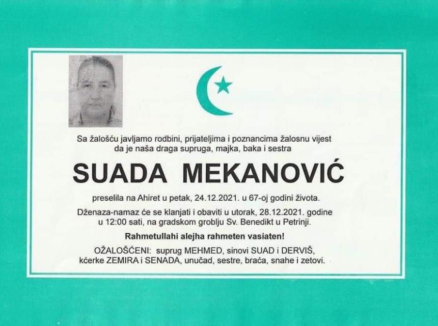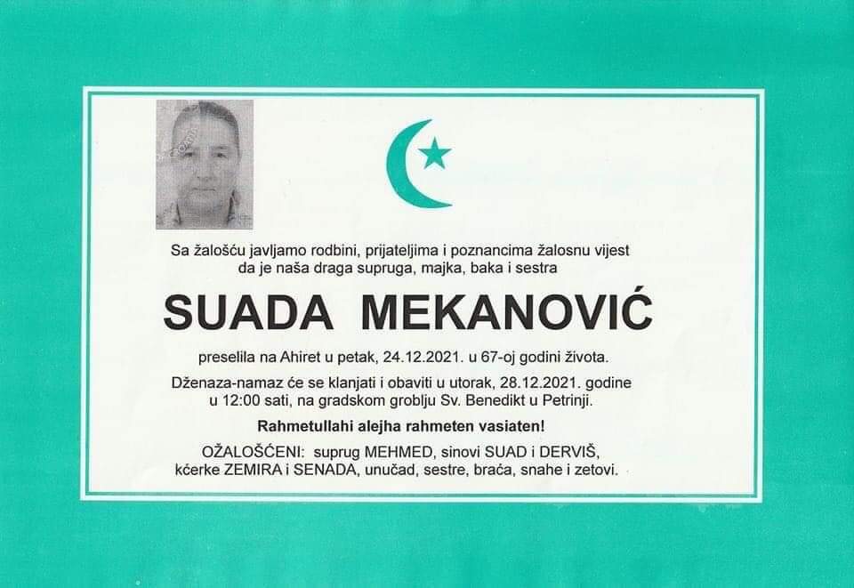 Tužnog srca i s bolom u duši obavještavamo rodbinu, komšije i prijatelje da je naša draga Suada Mekanović dana 24.12.2021. u 67. godini života preselila na ahiret.