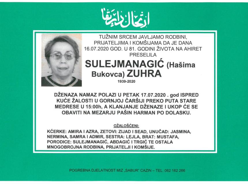 Tužnog srca i s bolom u duši obavještavamo rodbinu, komšije i prijatelje da je naša draga Sulejmanagić (Hašima Bukovca) Zuhra, dana 16. jula 2020. godine, u 81-oj godini života, preselila na Ahiret.