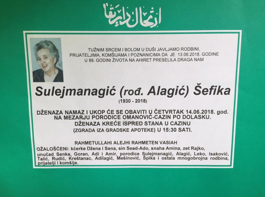 Tužnim srcem i bolom u duši javljamo rodbini,prijateljima,komšijama i poznanicima da je 13.06.2018. godine u 89. godini života na ahiret preselila draga nam Sulejmanagić(rođ. Alagić) Šefika.