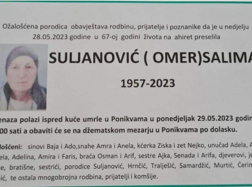 Tužnim srcem i bolom u duši javljamo rodbini, prijateljima i poznanicima da je naša draga Suljanović (Omer) Salima, dana 28.05.2023. godine tragičnim slučajem u 67-oj godini života, preselila na Ahiret.
