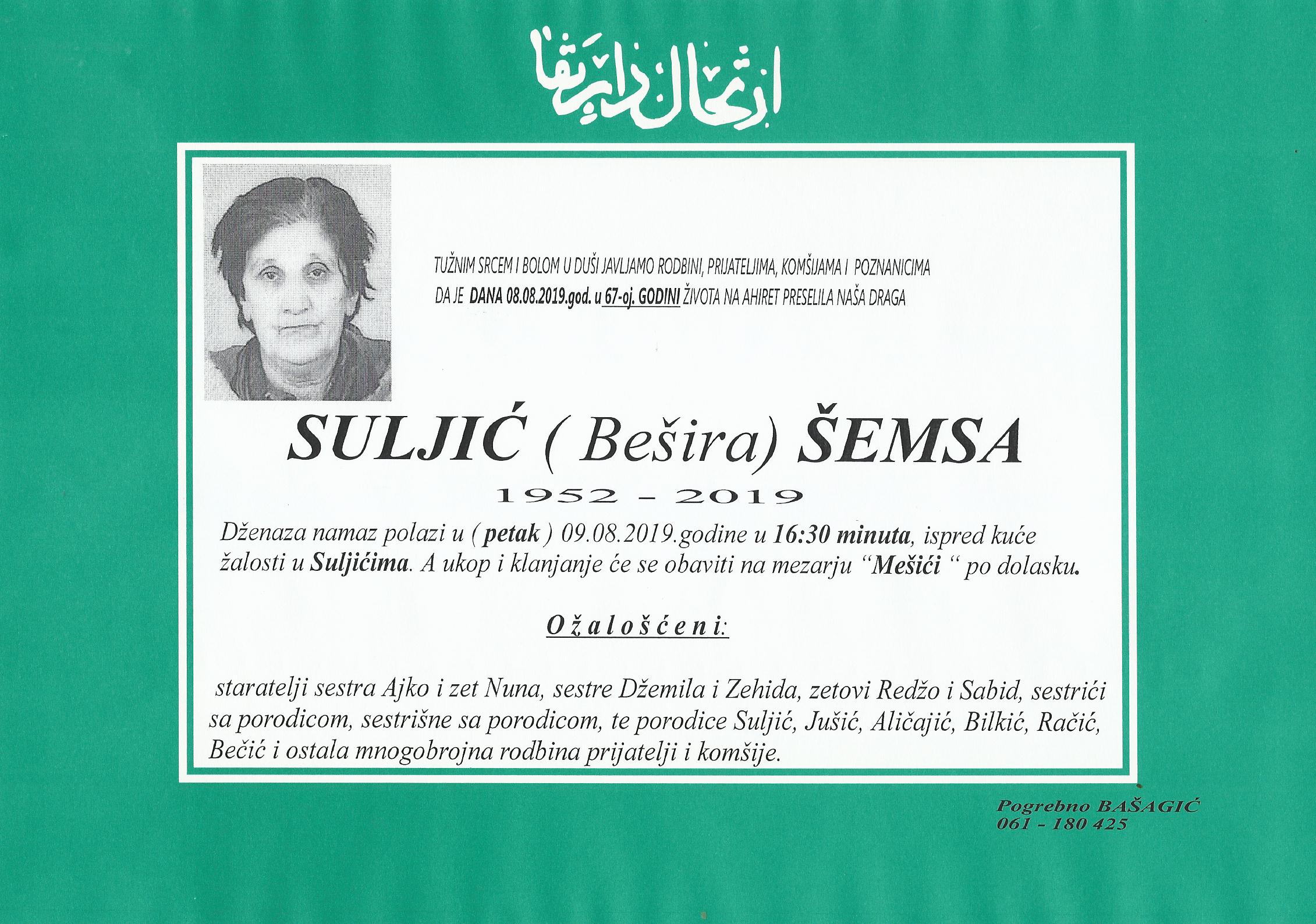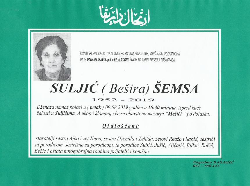 Tužnim srcem i bolom u duši javljamo rodbini, prijateljima, komšijama i poznanicima da je dana 08.08.2019.god. u 67-oj.godini života na Ahiret preselila naša draga Suljić (Bešira) Šemsa. Dženaza namaz polazi 09.08.2019. u 16:30, ispred kuće žalosti u Suljićima. Ukop i klanjanje će se obaviti na mezarju "Mešići" po dolasku.