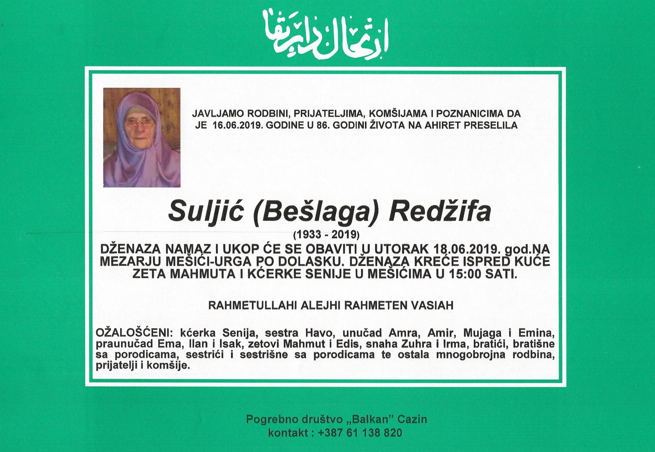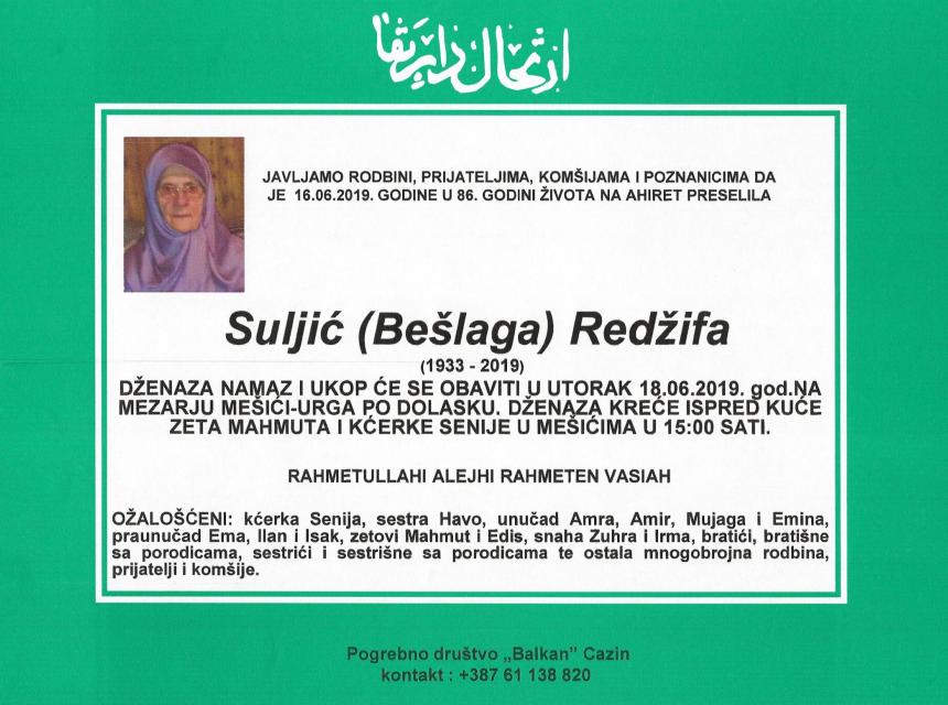 Javljamo rodbini, prijateljima, komšijama i poznanicima da je dana 16. 06. 2019. godine u 86.-oj godini života na Ahiret preselila Suljić (Bešlaga) Redžifa.