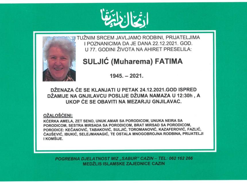 Tužnog srca i s bolom u duši obavještavamo rodbinu, komšije i prijatelje da je naša draga Suljić (Muharema) Fatima dana 22.12.2021. u 77. godini života preselila na ahiret.