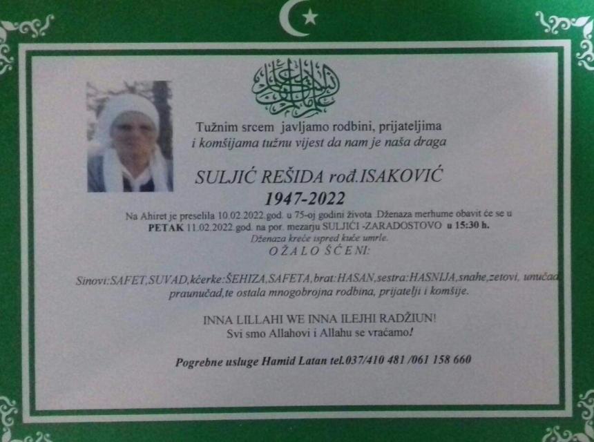 Tužnog srca i s bolom u duši obavještavamo rodbinu, komšije i prijatelje da je naša draga Suljić Rešida rođ. Isaković u 75. godini života dana 10.02.2022. preselila na ahiret.