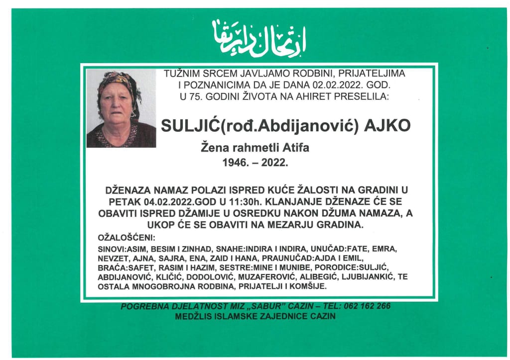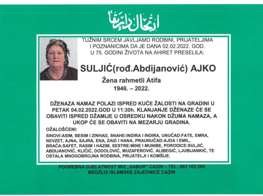 Tužnog srca i s bolom u duši obavještavamo rodbinu, komšije i prijatelje da je naša draga Suljić (rođ. Abdijanović) Ajko, dana 02.02.2022. godine, u 75-oj godini života, preselila na Ahiret.