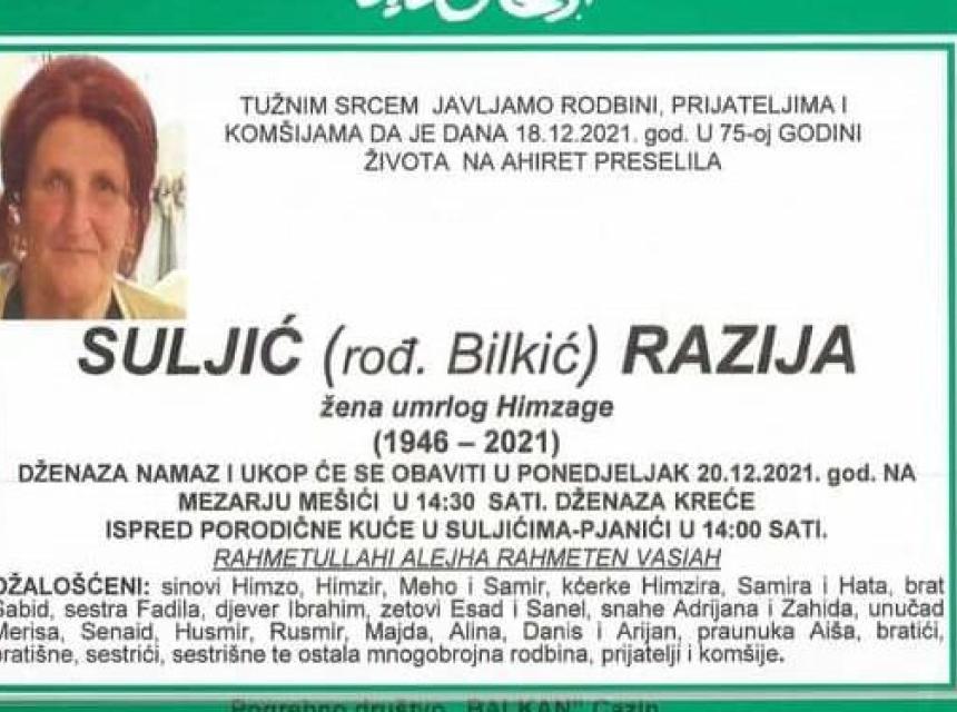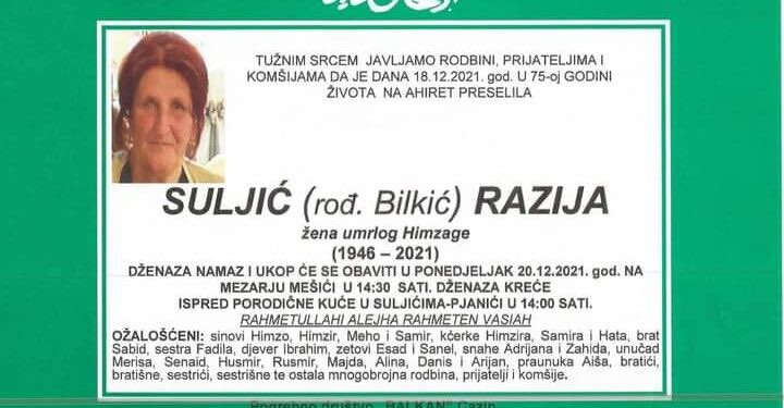 Tužnog srca i s bolom u duši vas obavještavamo da je naša draga Suljić (rođ. Bilkić) Razija, dana 18.12.2021. godine, u 75-oj godini života, preselila na Ahiret.