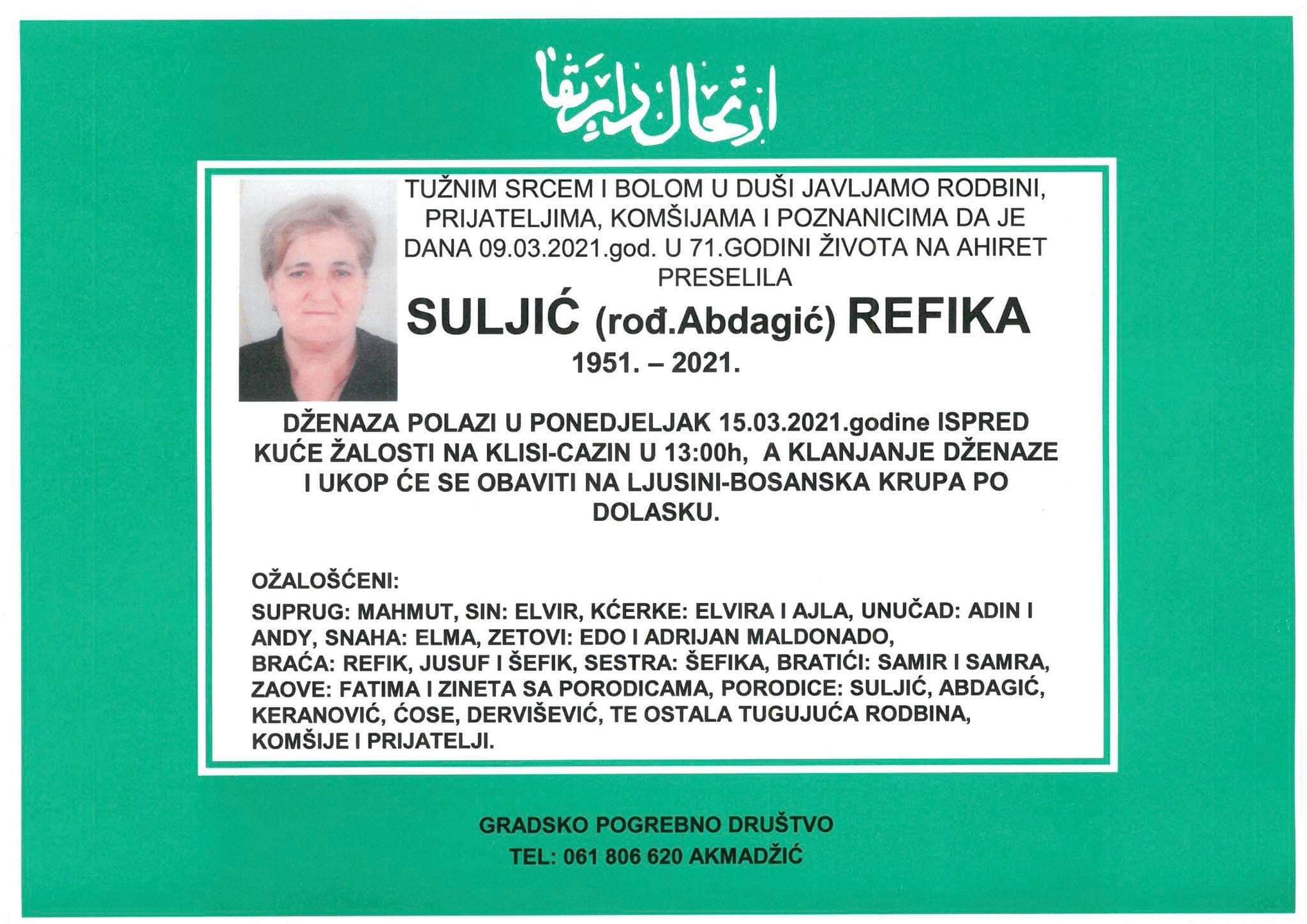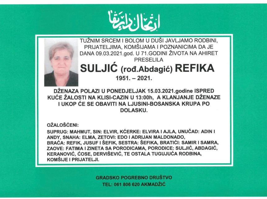 Tužnog srca i s bolom u duši obavještavamo rodbinu, komšije i prijatelje da je naša draga Suljić (rođ.Abdagić) Refika, dana 09.03.2021. godine, u 71-oj. godini života, preselila na Ahiret.