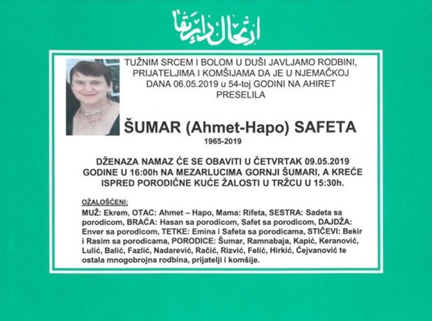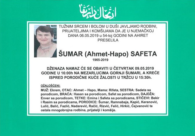 Tužnim srcem i bolom u duši javljamo rodbini, prijateljima i komšijama da je dana 06.05.2019. godine u 54. godini života na Ahiret preselila Šumar (Ahmet-Hapo) Safeta.