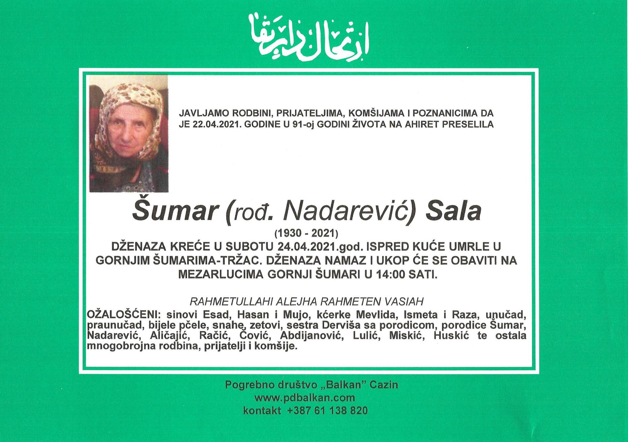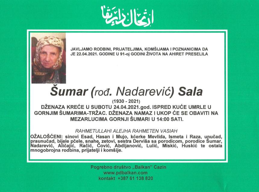 Tužnog srca i s bolom u duši obavještavamo rodbinu, komšije i prijatelje da je naša draga Šumar (rođ. Nadarević) Sala, dana 22.04.2021 godine, u 91-oj godini života, preselila na Ahiret.