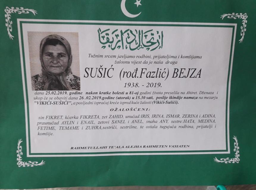 Tužnim srcem javljamo rodbini prijateljima i komšijama žalosnu vijest da je naša draga Sušić (rođ.Fazlić) Bejza dana 25.02.2019. godine nakon kratke bolesti u 81-oj godini života preselila na Ahiret.