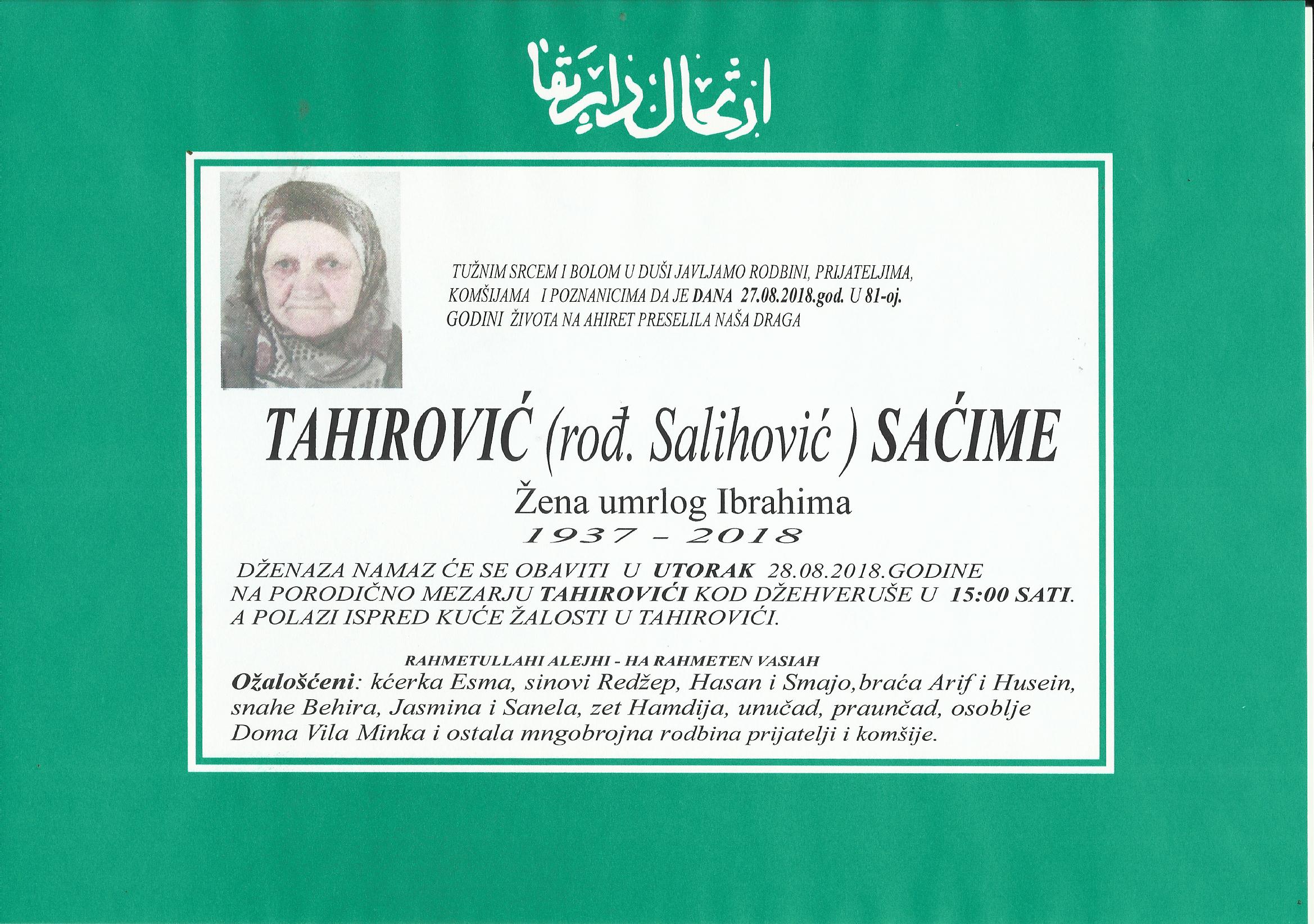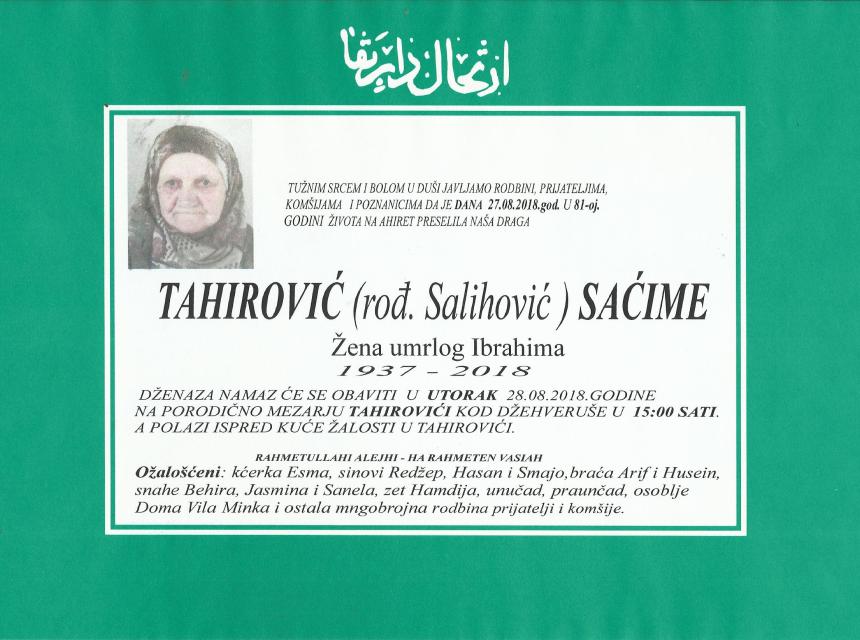 Tužnim srcem i bolom u duši javljamo rodbini, prijateljima, komšijama i poznanicima da je dana 27.08.2018.god. u 81-oj. godini na Ahiret preselila Tahirović (rođ. Salihović) Saćime.