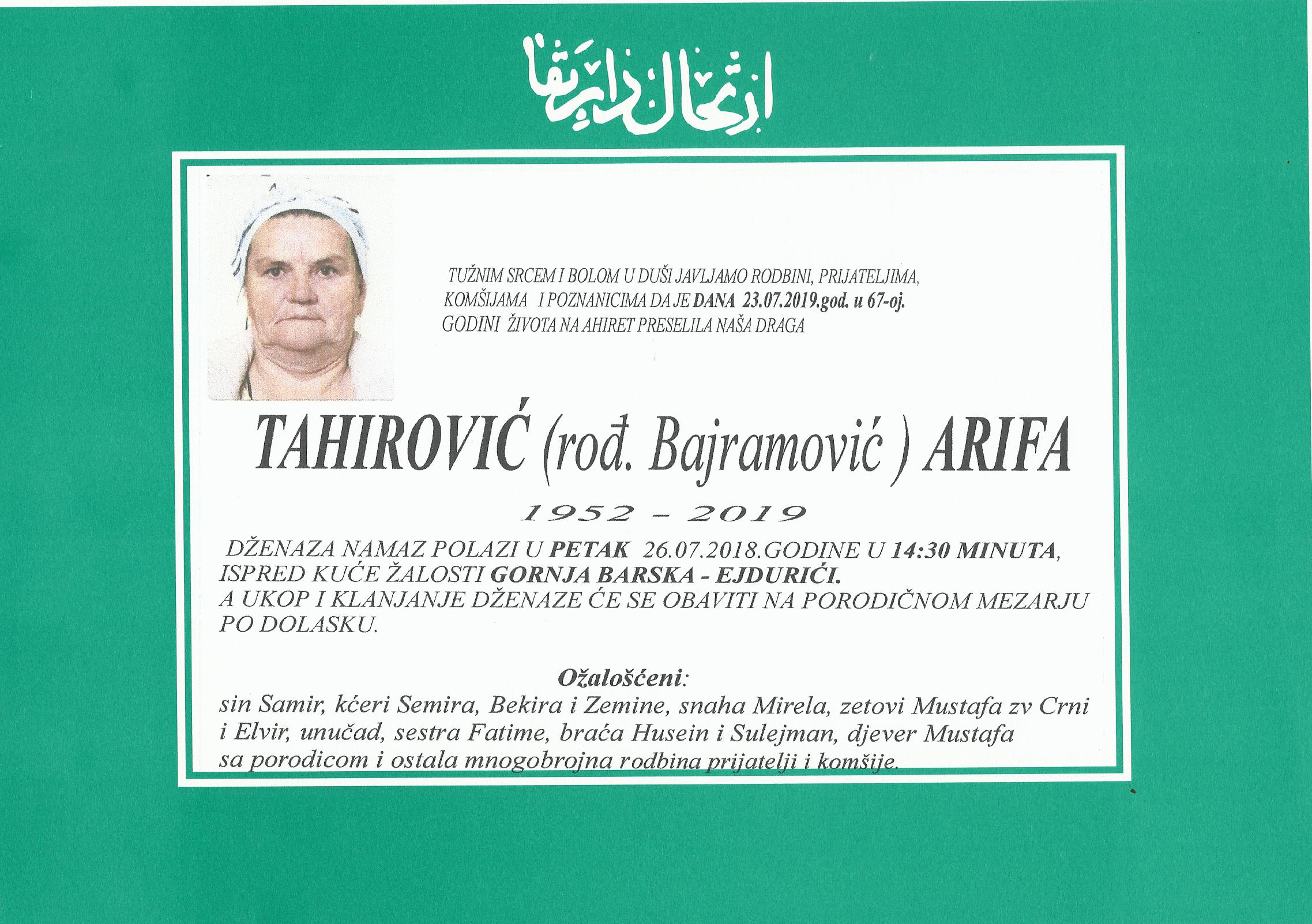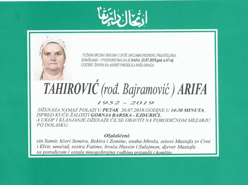 Sa žalošću javljamo rodbini, prijateljima i poznanicima da je dana 23.07.2019. godine u 67-oj godini života na Ahiret preselila naša draga Tahirović (rođena Bajramović) Arifa.
