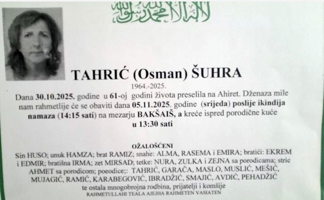 Dženaza mile nam rahmetlije će se obaviti dana 05.11.2025. godine (srijeda) poslije ikindija namaza (14:15 sati) na mezarju BAKŠAIŠ, a kreće ispred porodične kuće u 13:30 sati