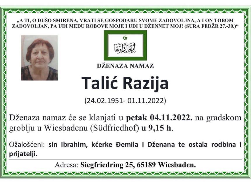 Sa žalošću javljamo rodbini, prijateljima i poznanicima da je naša draga Talić Razija preselila na Ahiret.