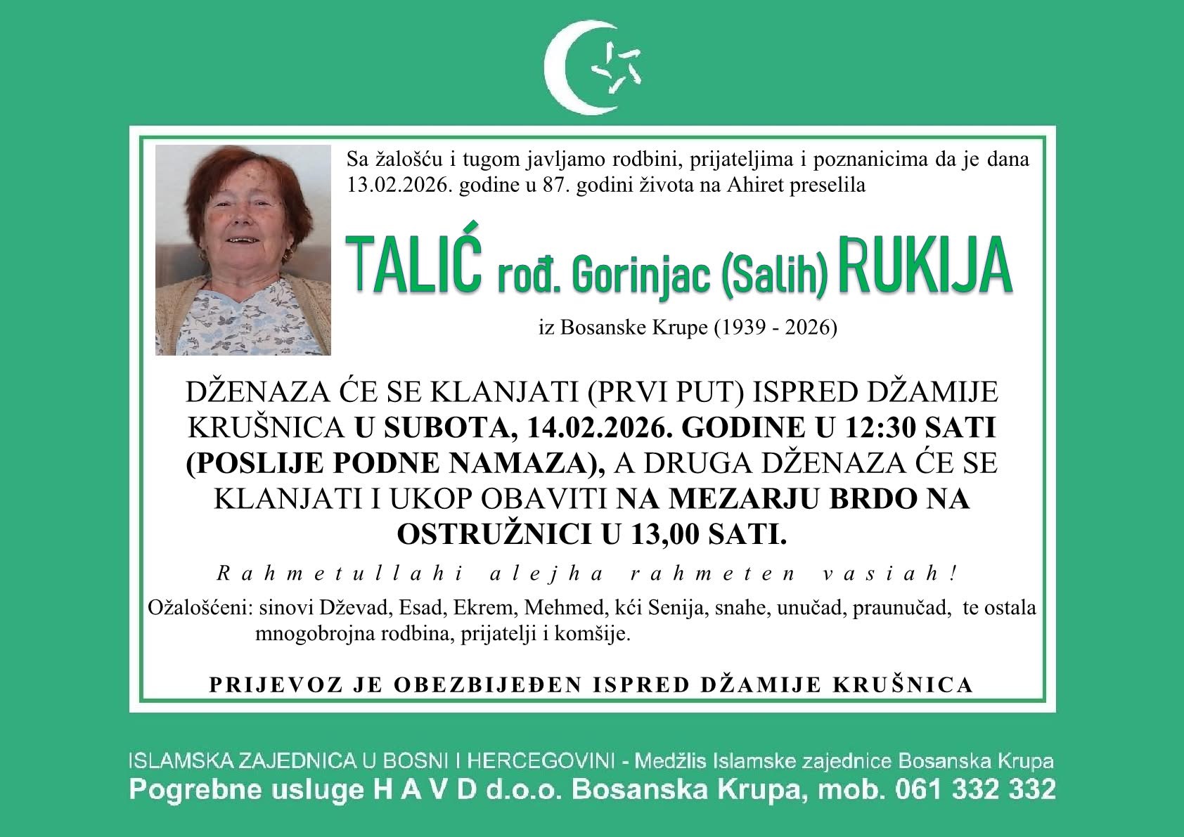 Dženaza će se klanjati (prvi put) ispred džamije Krušnica u subotu, 14.02.2026. godine u 12:30 sati (poslije podne-namaza), a druga dženaza će se klanjati i ukop obaviti na mezarju Brdo na Ostružnici u 13:00 sati.