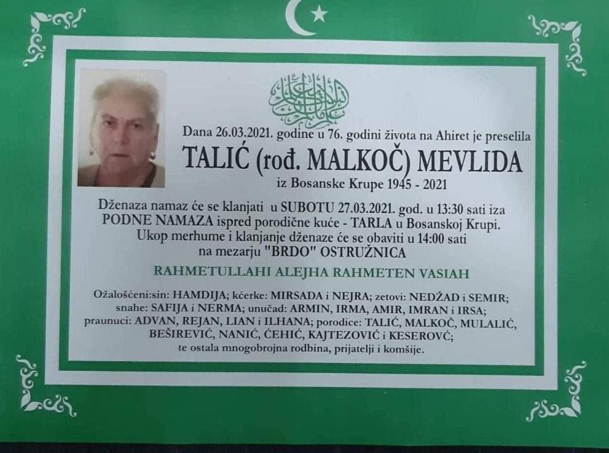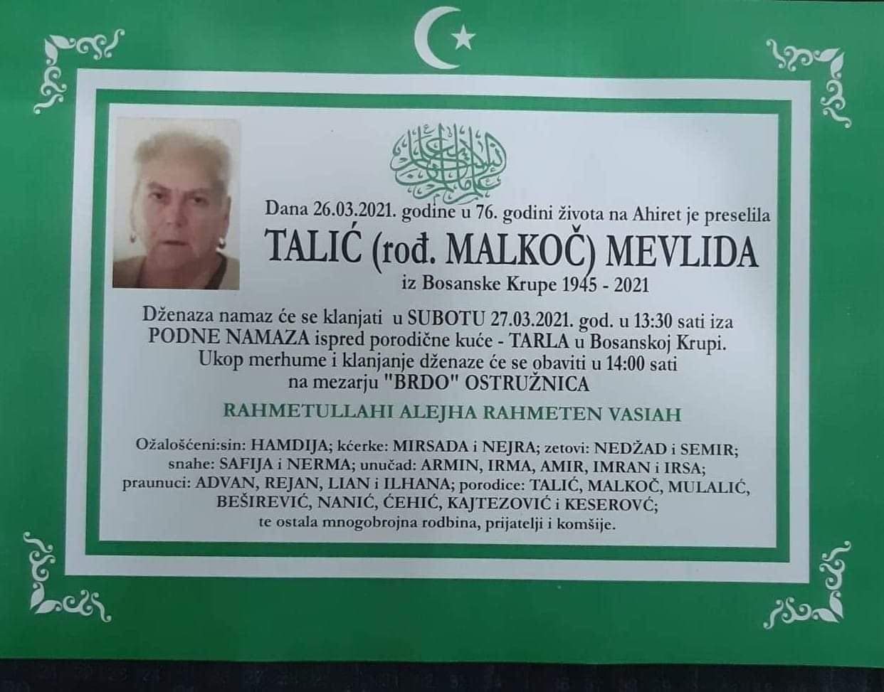 Tužnog srca i s bolom u duši obavještavamo rodbinu, komšije i prijatelje da je naša draga Talić (rođ. Malkoč) Mevlida, dana 26.03.2021. godine, u 76. godini života, preselila na Ahiret.