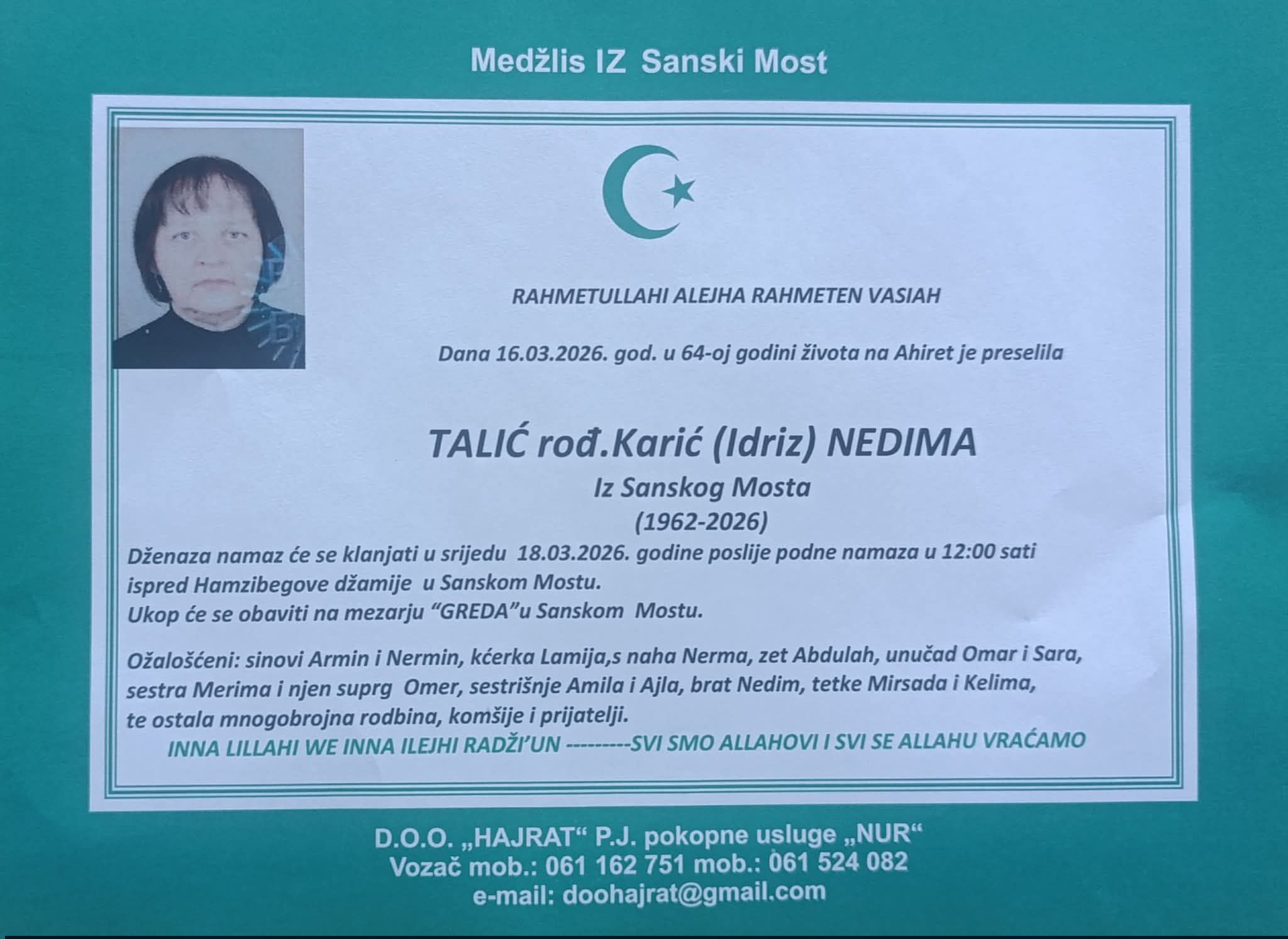 Dženaza namaz će se klanjati u srijedu 18.03.2026. godine poslije podne namaza u 12:00 sati ispred Hamzibegove džamije u Sanskom Mostu.