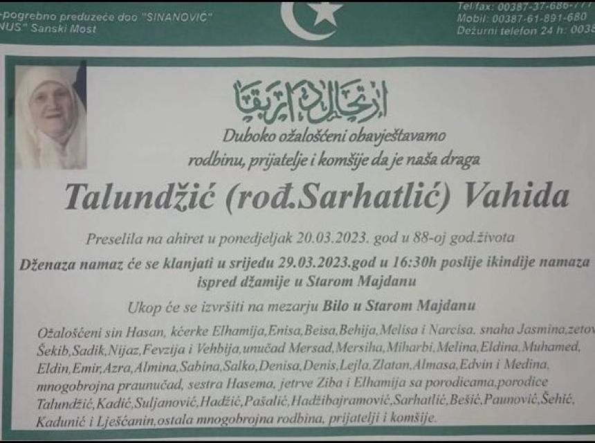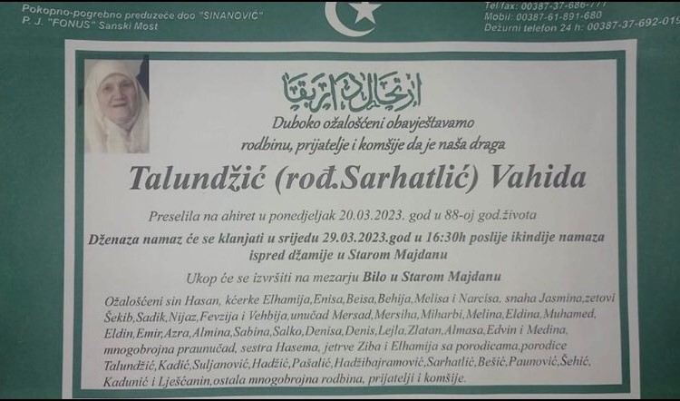Tužnim srcem javljamo rodbini, prijateljima i poznanicima da je naša draga Talundžić (rođ. Sarhatlić) Vahida dana 20.03.2023. godine u 88-oj godini života na Ahiret preselila.