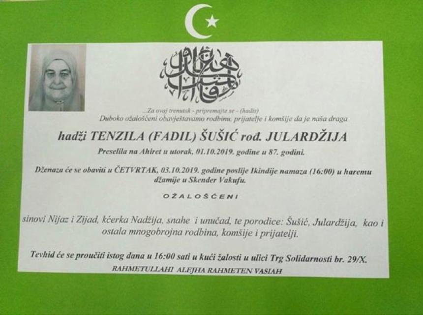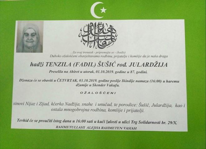 Tužnim srcem i bolom u duši javljamo rodbini, prijateljima i komšijama da je dana 01.10.2019. god. u 87.godini života na Ahiret preselila Tenzila (Fadil) Šušić rođ. Julardžija. Dženaza namaz će se obaviti u četvrtak 03.10.2019. poslije ikindije namaza (16:00 h) u haremu džamije u Skender Vakufu.