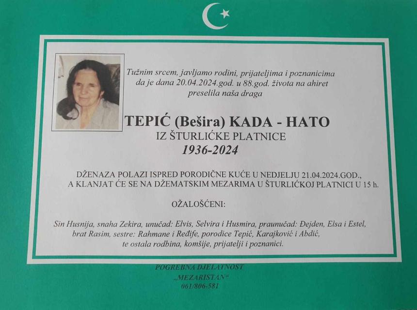 Obavještavamo rodbinu, prijatelje, poznanike i komšije da je dana 20.04.2024.god.u 88.godini života je na Ahiret preselila naša Tepić (Bešira) Kado – Hato.