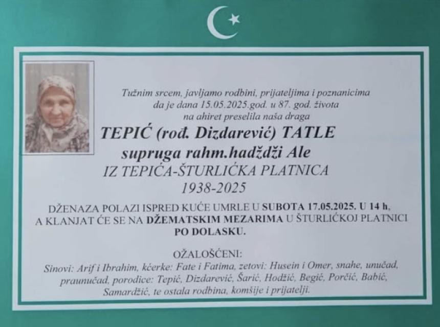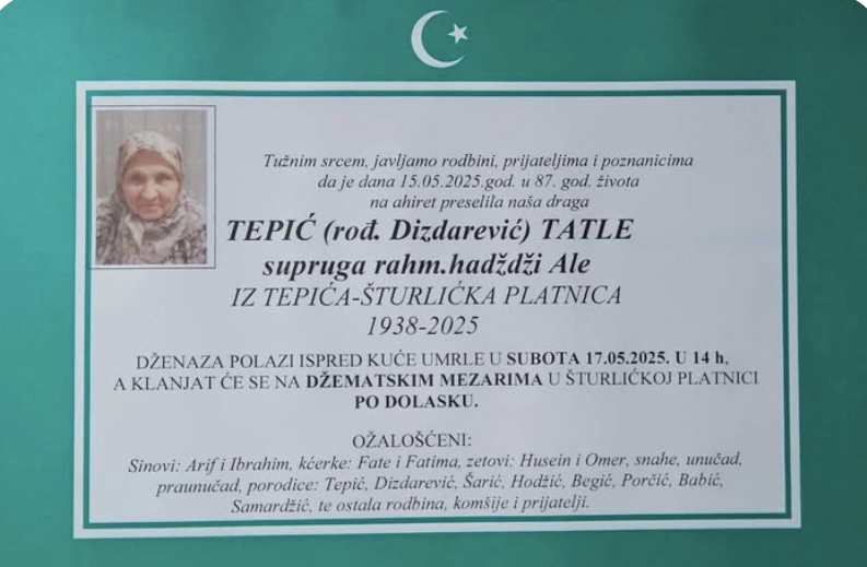 Dženaza polazi ispred kuće umrle u subotu 17.05.2025. godine u 14:00h, a klanjat će se na džematskim mezarima u ŠTURLIČKOJ PLATNICI po dolasku.