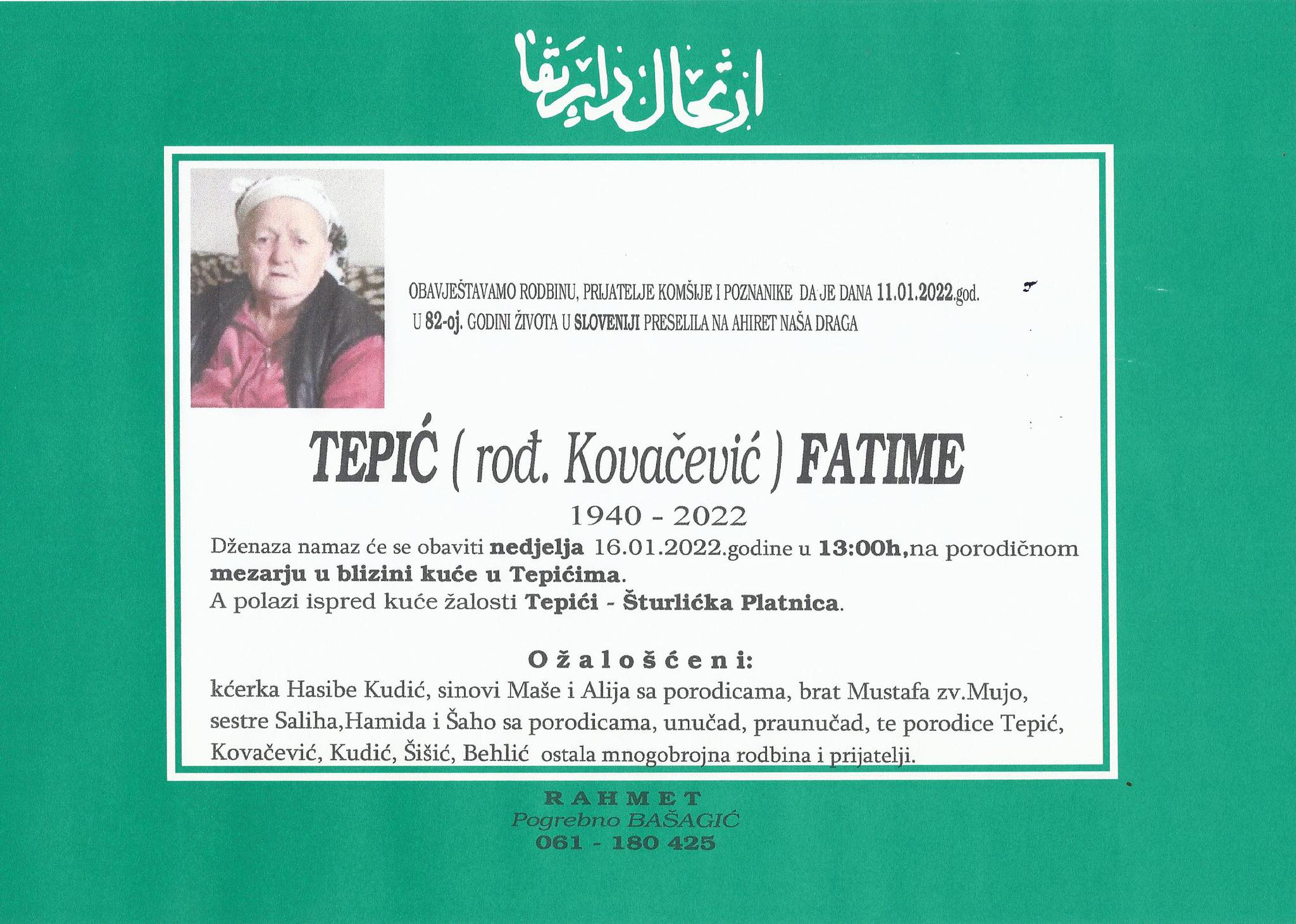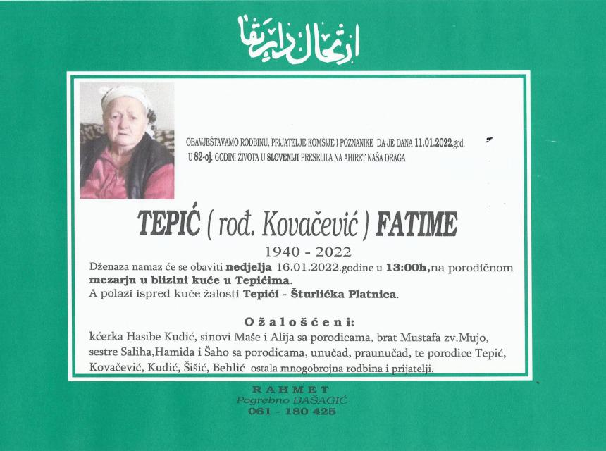 Obavještavamo rodbinu, komšije, prijatelje i poznanike da je dana 11.1.2022.god, u 82. godini života u Sloveniji na Ahiret preselila naša draga Tepić (rođ. Kovačević) Fatime. Dženaza namaz će se obaviti u nedjelju, 16.1.2022. godine, u 13h, na porodičnom u blizini porodične kuće u Tepićima. A polazi ispred kuće žalosti u Tepićima.