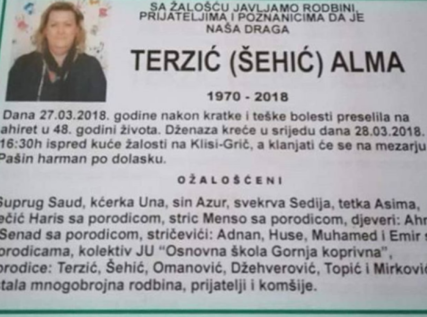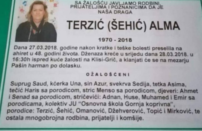 Tužnim srcem i bolom u duši javljamo rodbini, prijateljima, komšijama i poznanicima da je dana 27.03.2018. godine u 48-oj godini života na Ahiret preselila Terzić (Šehić) Alma.