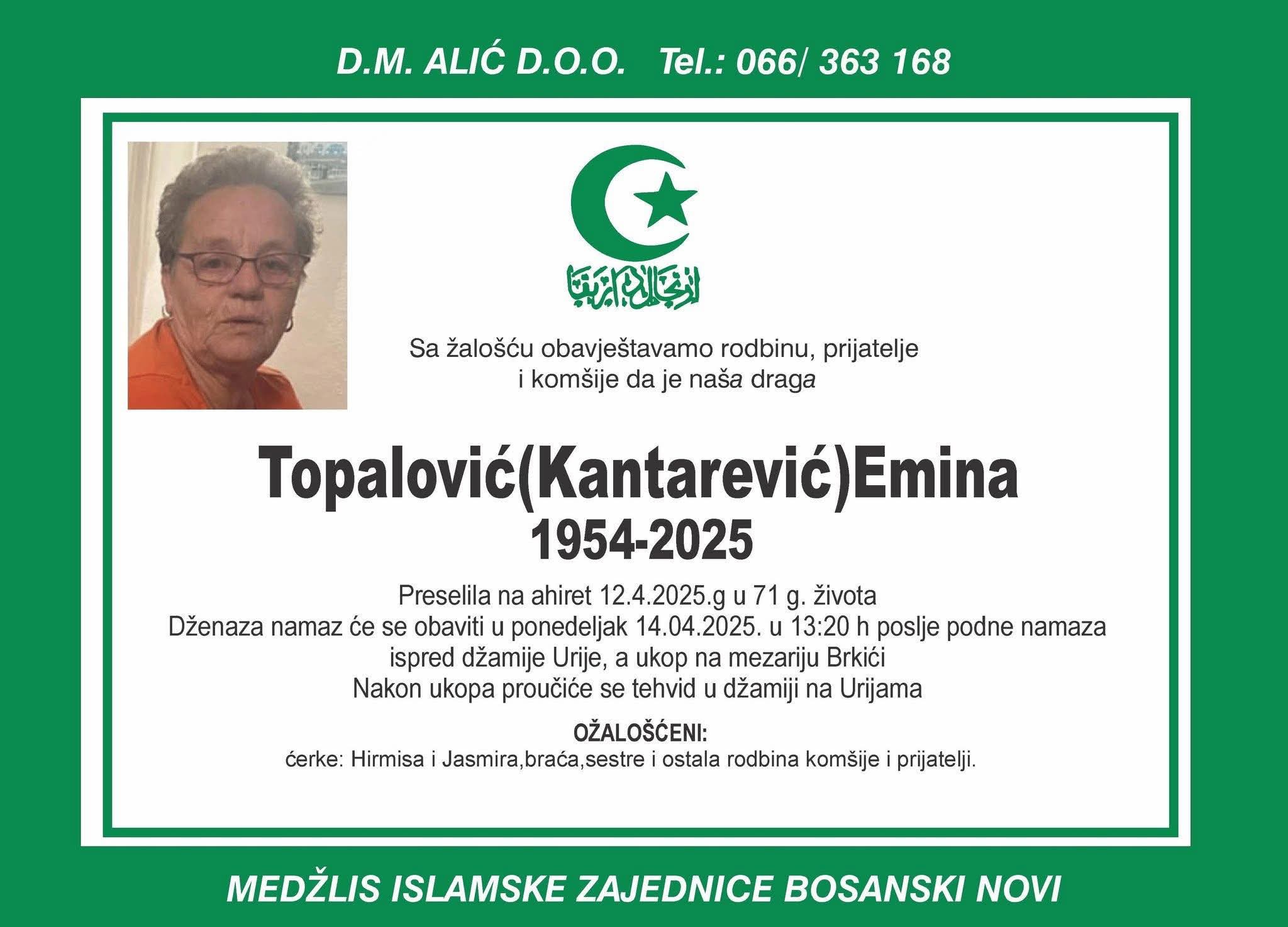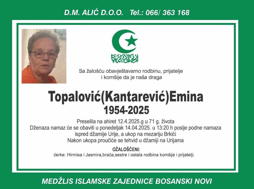 Preselila na ahiret 12.04.2025.g u 71 g. života. Dženaza namaz će se obaviti u ponedeljak 14.04.2025. u 13:20 h poslije podne namaza ispred džamije Urije, a ukop na mezariju Brkići. Nakon ukopa poručiće se tevhid u džamiji na Urijama.