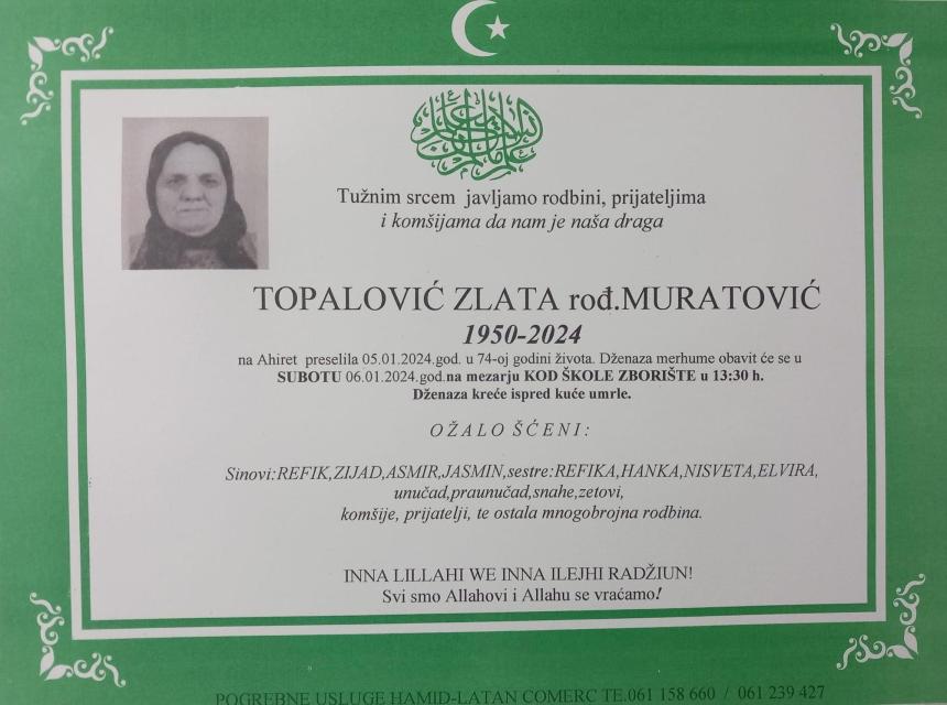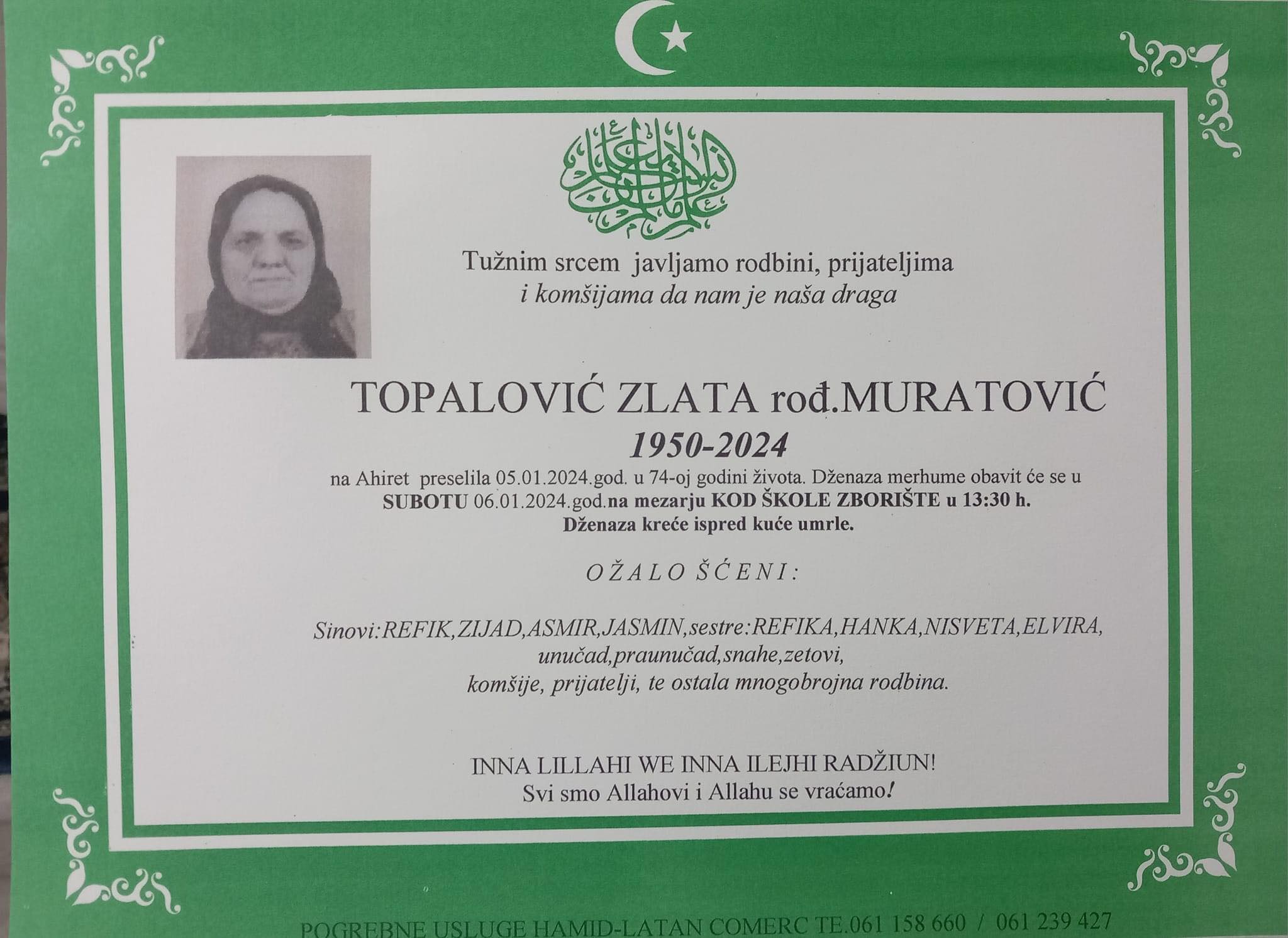 Tuznog srca obavjestavamo rodbinu, prijatelje i komsije da je nasa draga Topalović Zlata rođ. Muratović preselila na ahiret dana 05.01.2024. godine, u 74. godini zivota.