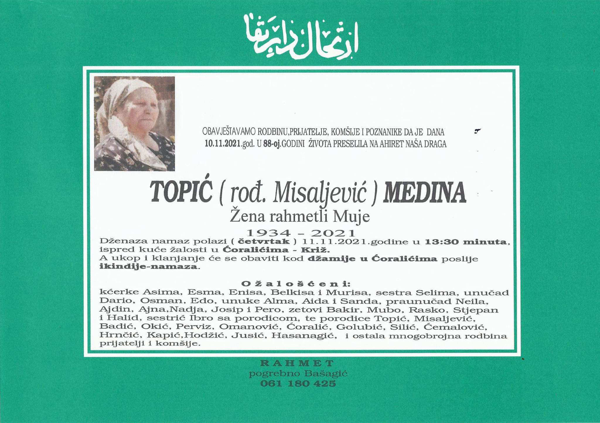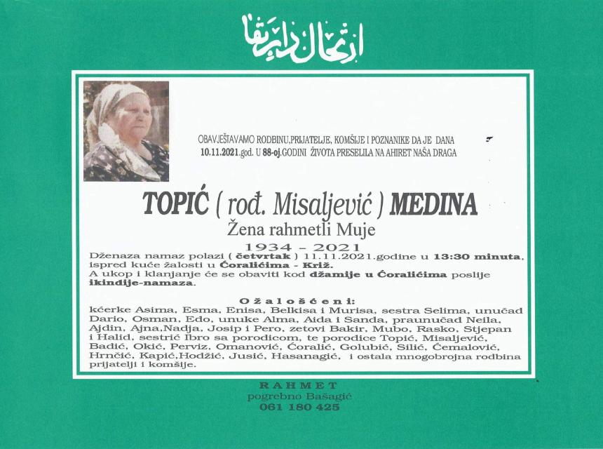Tužnog srca i s bolom u duši obavještavamo rodbinu, komšije i prijatelje da je naša draga Topić (rođ. Misaljević) Medina dana 10.11.2021. u 88. godini života preselila na ahiret.