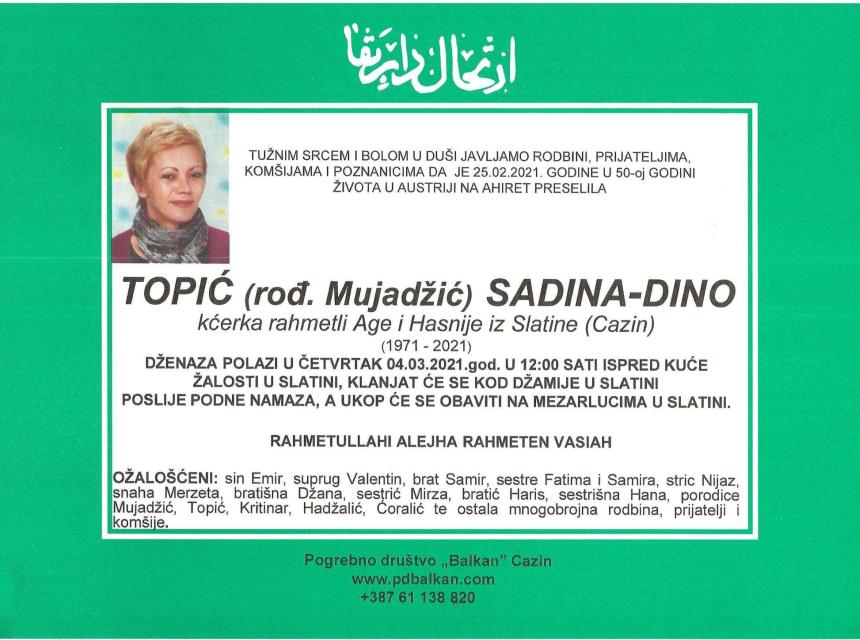 Tužnog srca i s bolom u duši obavještavamo rodbinu, komšije i prijatelje da je naša draga Topić (rođ. Mujadžić) Sadina-Dino, dana 25.02.2021. godine, u 50-oj. godini života, preselila na Ahiret.