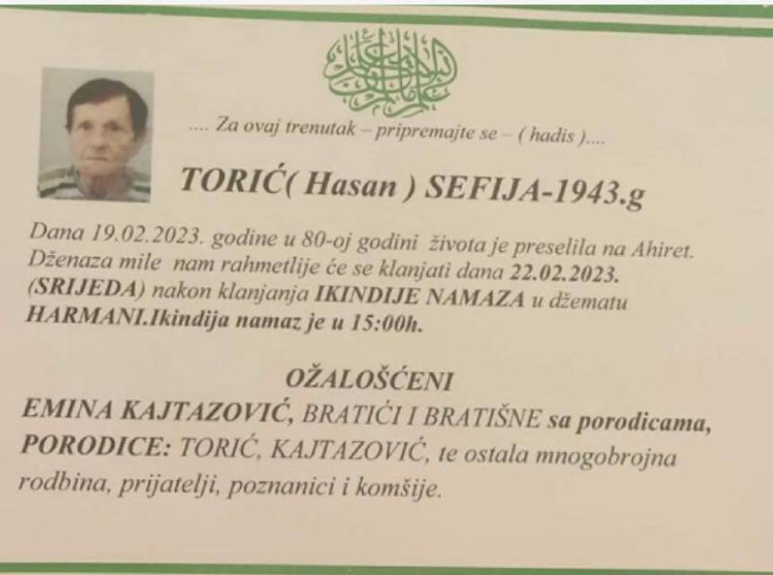 Duboko ožalošćeni obavještavamo rodbinu, prijatelje i komšije da je naša draga Torić (Hasan) Sefija dana 19.02.2023. godine preselila na Ahiret u 80. godini života.