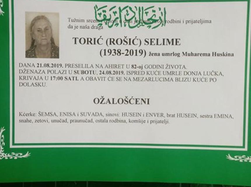 Tužnim srcem javljamo rodbini, prijateljima i komšijama da je dana 21.08.2019.god. u 82 godini života na Ahiret preselila Torić (Rošić) Selime.