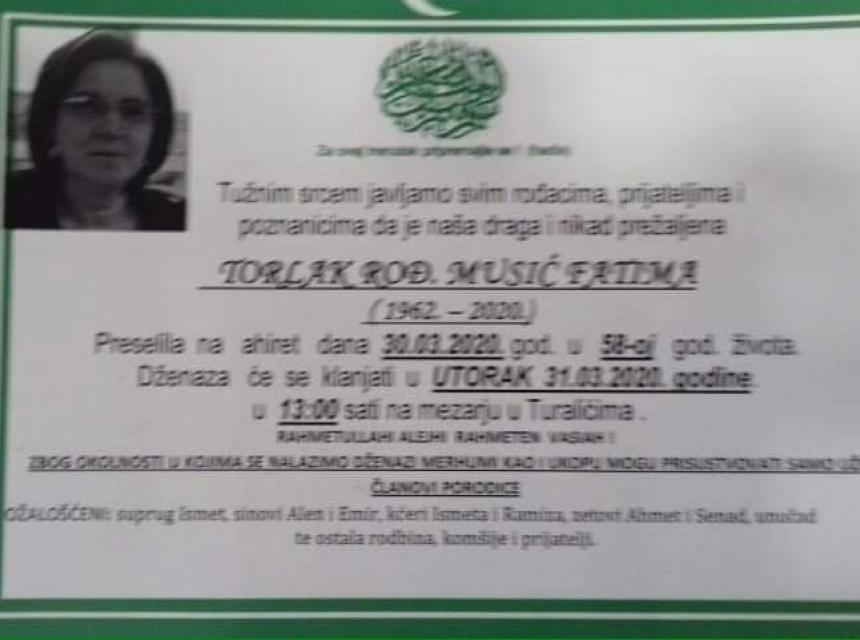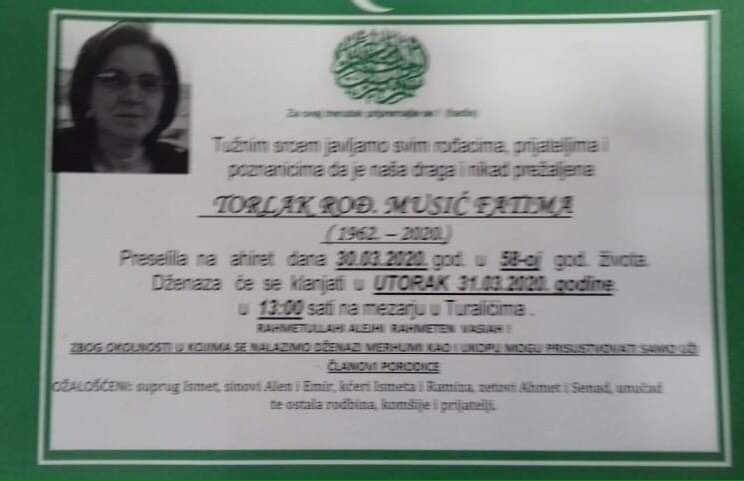Tužnim srcem i bolom u duši javljamo rodbini i prijateljima da je naša draga i nikad prežaljena Torlak (Musić) Fatima dana 30.03.2020. godine u 58-oj godini života preselila na Ahiret.