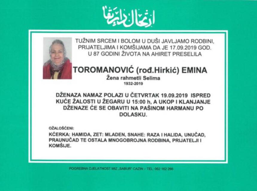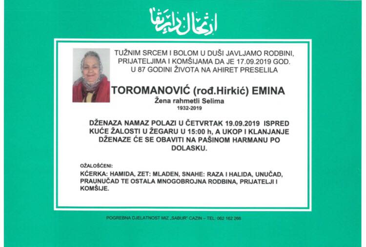 Tužnim srcem i bolom u duši javljamo prijateljima, komšijama i rodbini da je 17.09.2019.god. u 87.-oj godini života na Ahiret preselila Toromanović (rođ.Hirkić) Emina.