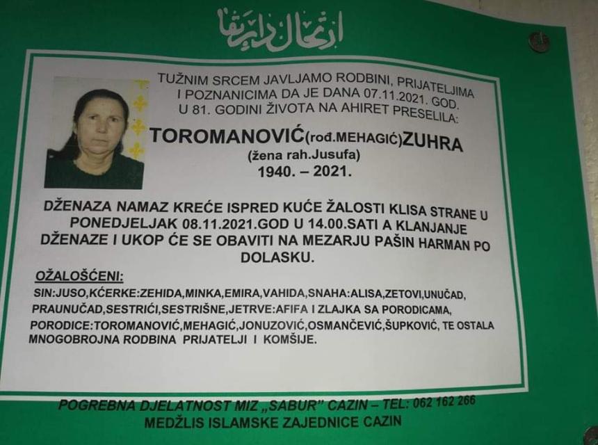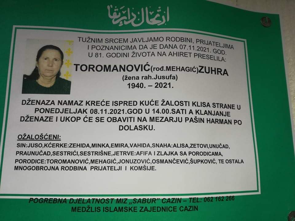Tužnog srca i s bolom u duši obavještavamo rodbinu, komšije i prijatelje da je naša draga Toromanović (Mehagić) Zuhra dana 07.11.2021. u 81. godini života preselila na ahiret.
