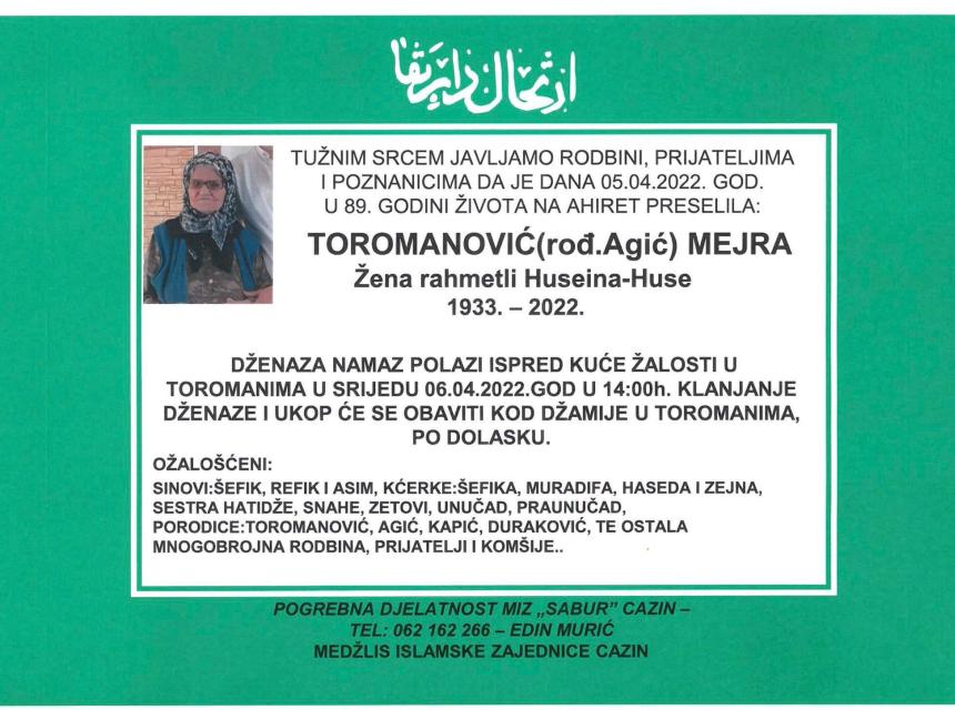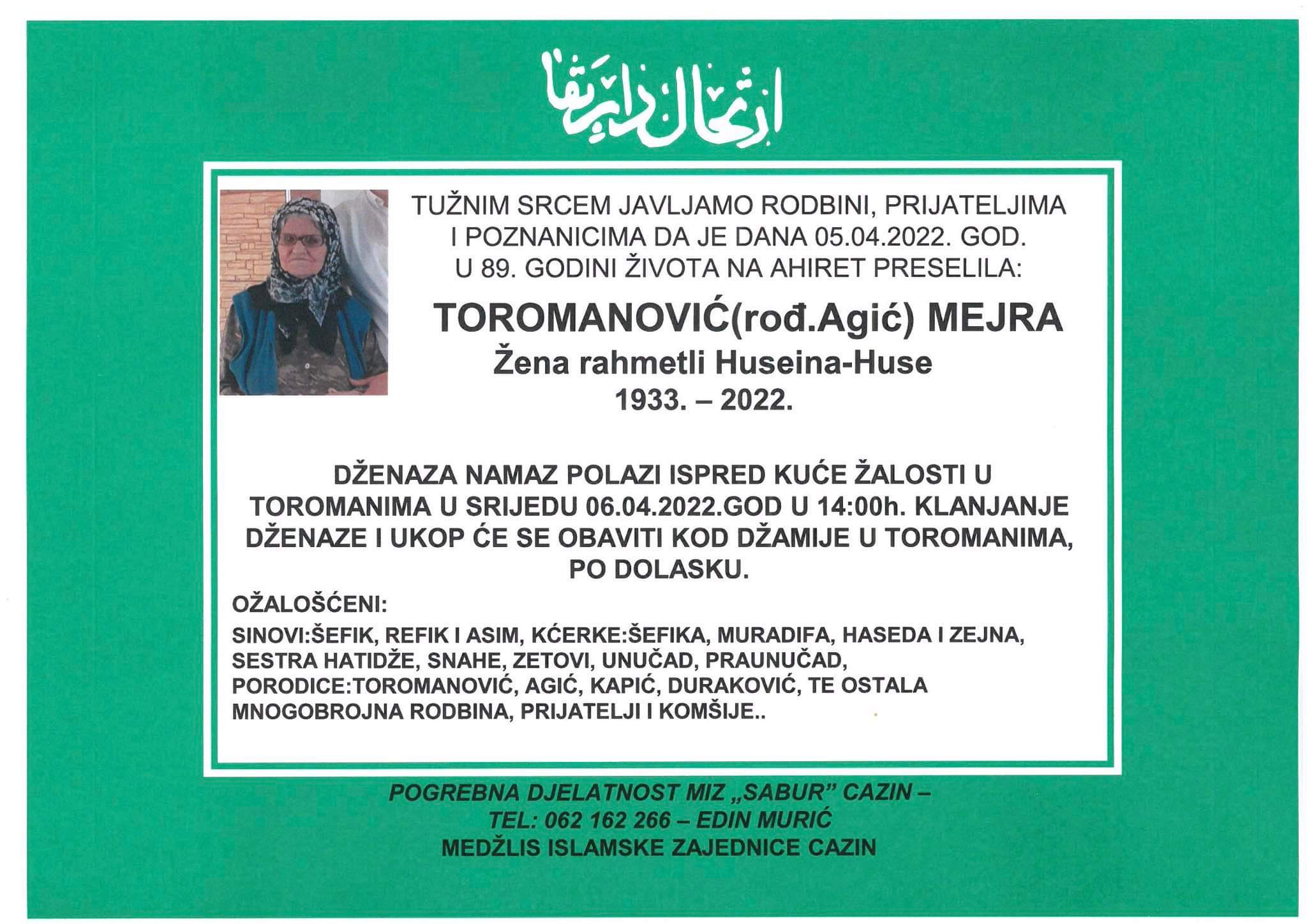 Tužnog srca i s bolom u duši obavještavamo rodbinu, komšije i prijatelje da je naša draga Toromanović (rođ. Agić) Mjera u 89. godini života preselila na Ahiret.