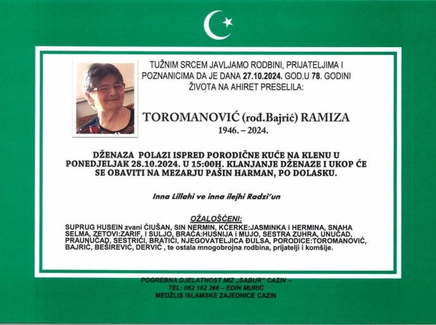 Obavještavamo rodbinu i prijatelje da je 27.10.2024. godine na ahiret u 78. godini života preselila Toromanović (rođ. Bajrić) Ramiza.