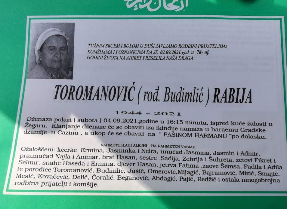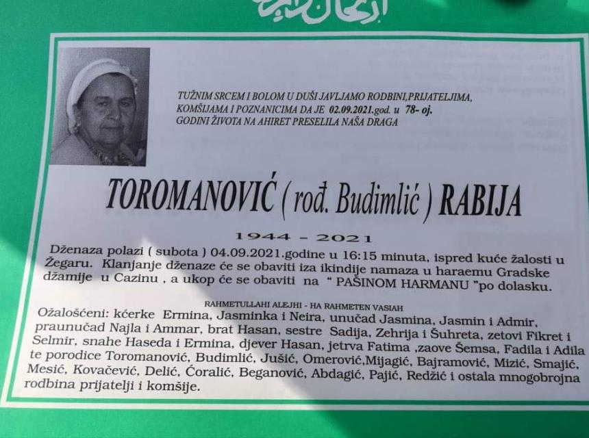 Tužnog srca i s bolom u duši obavještavamo rodbinu, komšije i prijatelje da je naša draga Toromanović (rođ. Budimlić) Rabija dana 02.09.2021. godine, u 78. godini života, preselila na ahiret.