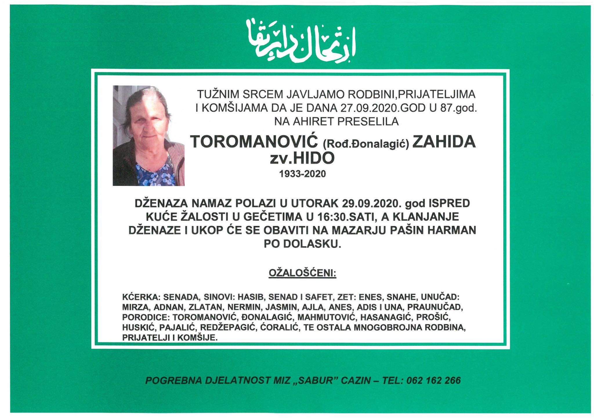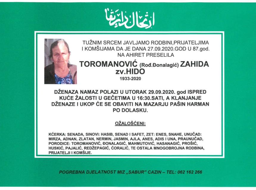 Tužnog srca i s bolom u duši obavještavamo rodbinu, komšije i prijatelje da je naša draga Toromanović (rođ. Đonalagić) Zahida zv. Hido dana 27. septembra 2020. godine, u 87. godini života, preselila na Ahiret.