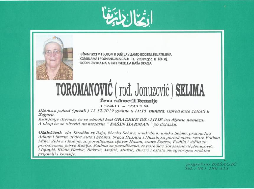 Sa tužnim srcem i bolom u duši, javljamo rodbini i prijateljima da je dana 11. decembra 2019. godine naša draga Toromanović (rođ. Jonuzović) Selima, preselila na Ahiret u 80. godini života.