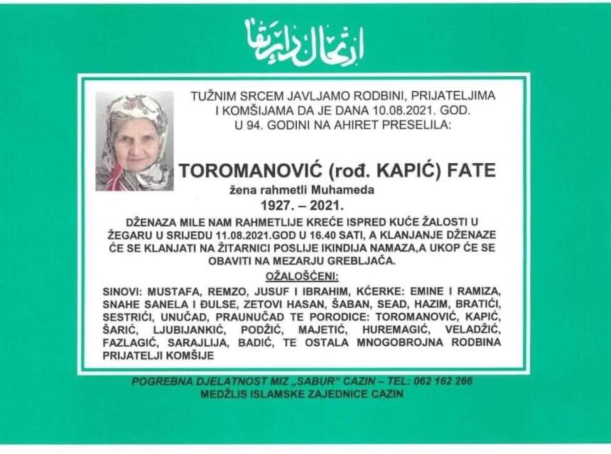 Tužnog srca i s bolom u duši obavještavamo rodbinu, komšije i prijatelje da je naša draga Toromanović (rođ. Kapić) Fate, dana 10.08.2021 godine, u 94-oj godini života, preselila na Ahiret.