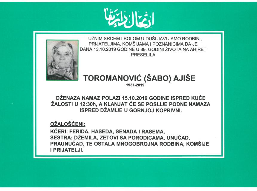 Tužnim srcem i bolom u duši javljamo rodbini, prijateljima, komšijama i poznanicima da je dana13.10.2019. godine u 89. godini života na Ahiret preselula Toromanović (Šabo) Ajiše.