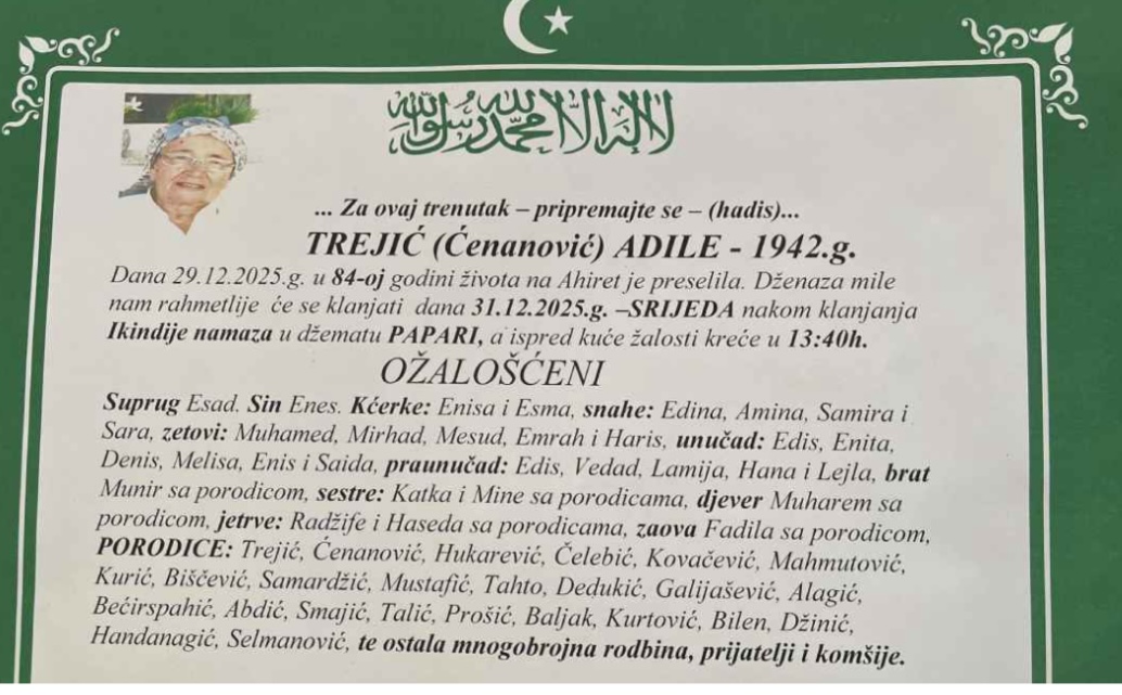Dženaza mile nam rahmetliji će se klanjati dana 31.12.2025. godine – SRIJEDA, nakon klanjanja ikindije-namaza u džematu Papari, a ispred kuće žalosti kreće u 13:40 h.