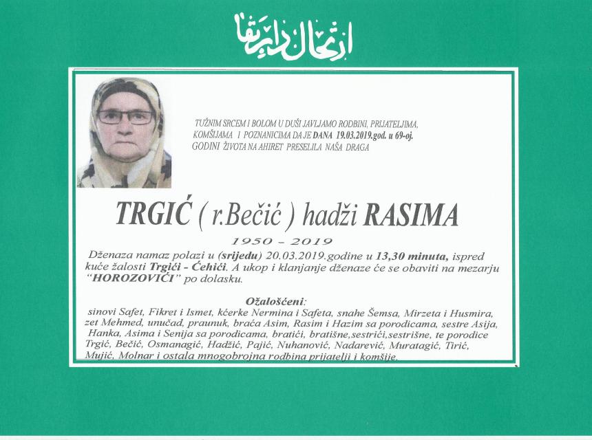 Tužnim srcem i bolom u duši javljamo rodbini, prijateljima, komšijama i poznanicima da je dana 19.03.2019. god. u 69-oj. godini života na Ahiret preselila naša draga Trgić ( r.Bečić ) hadži Rasima.