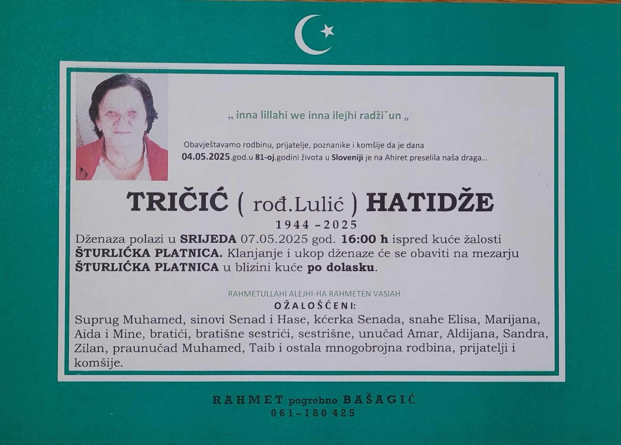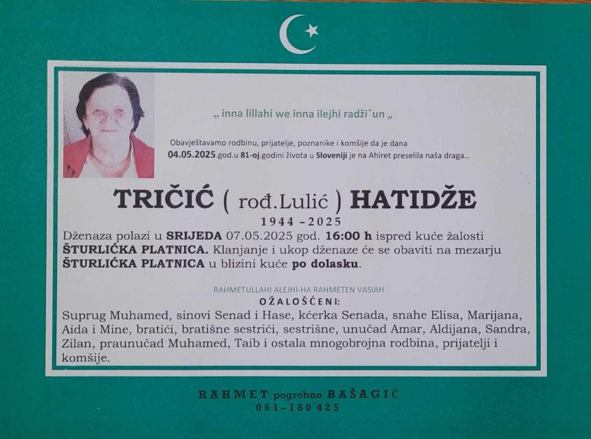 Dženaza polazi u SRIJEDA 07.05.2025. god. 16:00 h ispred kuće žalosti ŠTURLIČKA PLATNICA.