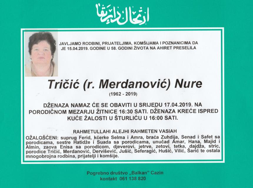 Tužnim srcem i bolom u duši Vam javljamo da je 15.04.2019. godine u 58.-oj godini života na Ahiret preselila Tričić (rođ. Merdanović) Nure.