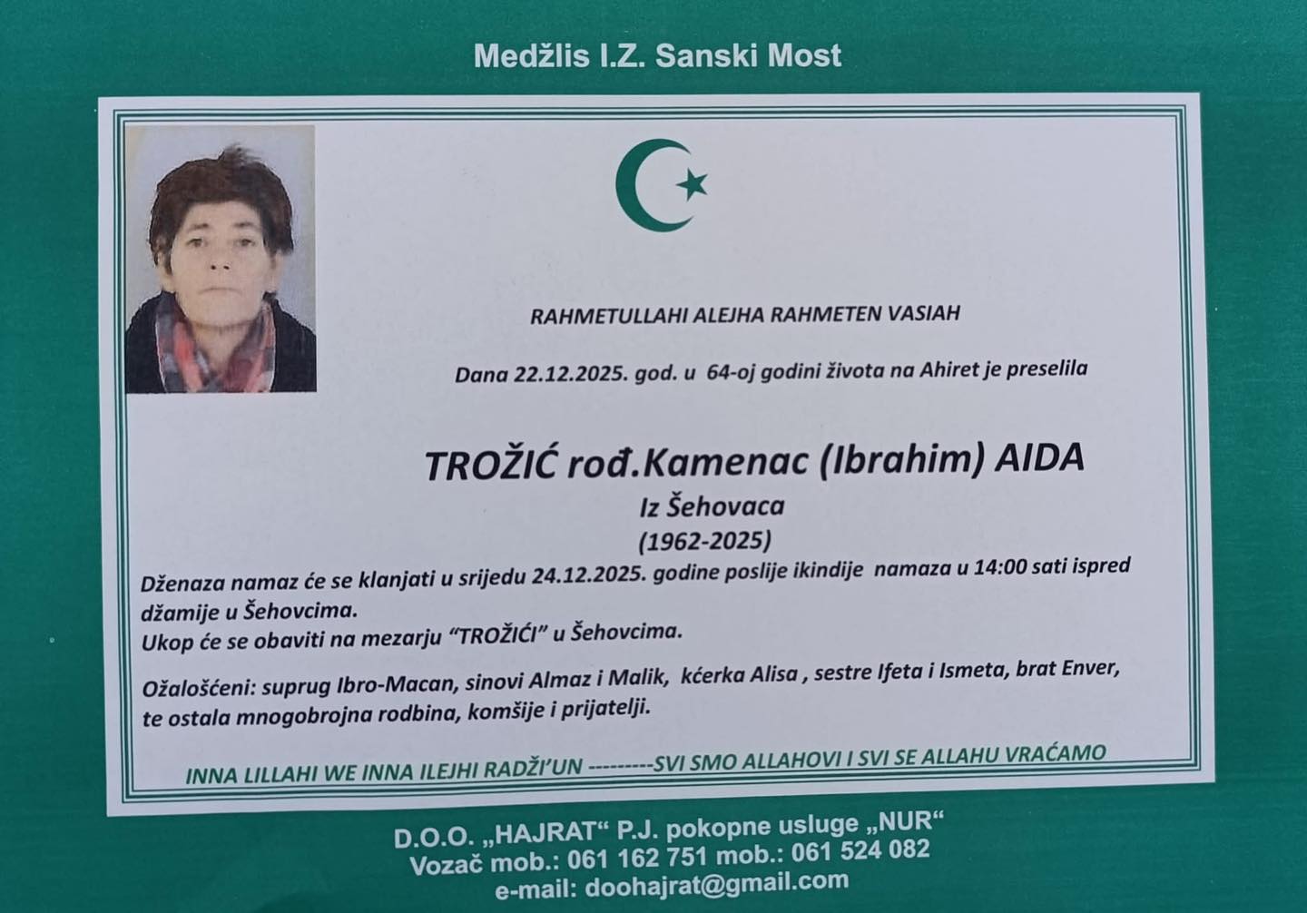 Dženaza namaz će se klanjati u srijedu 24.12.2025. godine poslije ikindije namaza u 14:00 sati ispred džamije u Šehovcima.