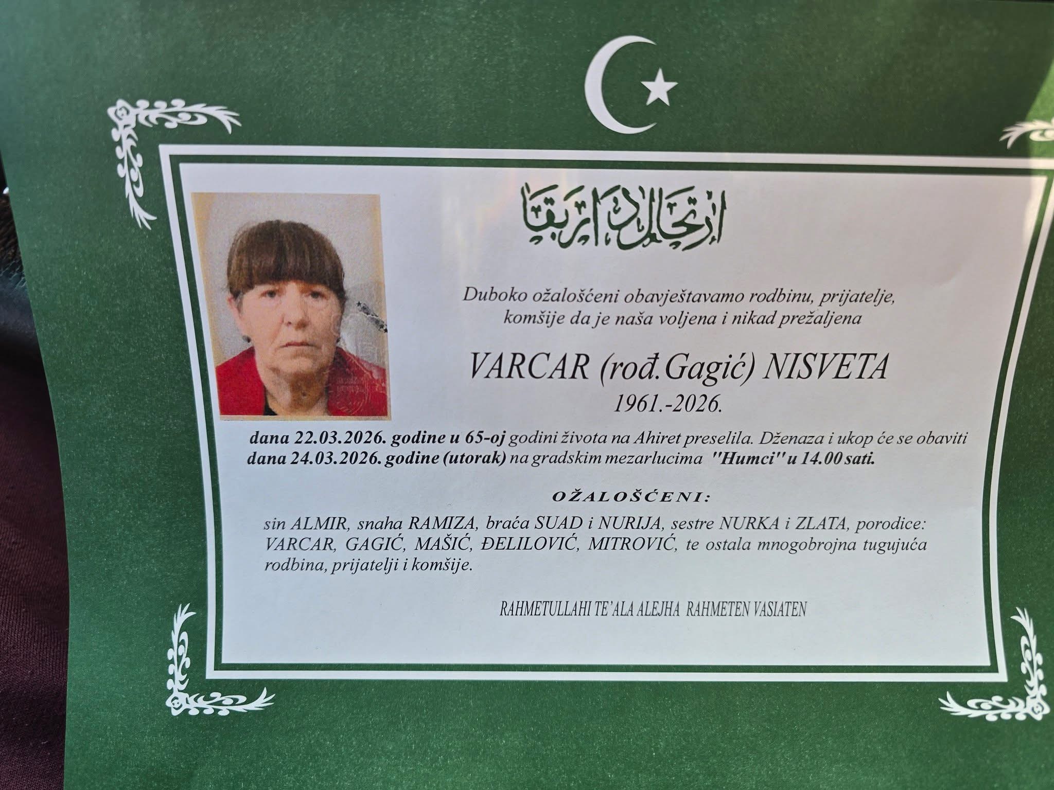 Dženaza i ukop će se obaviti dana 24.03.2026. godine (utorak) na gradskim mezarlucima „Humci“ u 14:00 sati.