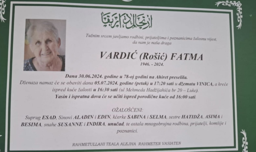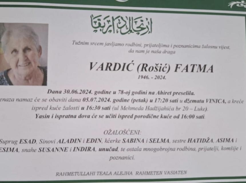 Tužnim srcem i bolom u duši javljamo rodbini, prijateljima i komšijama da je naša draga Vardić (Rošić) Fatma, dana 30.06.2024. godine u 78-oj godini života, preselila na Ahiret.